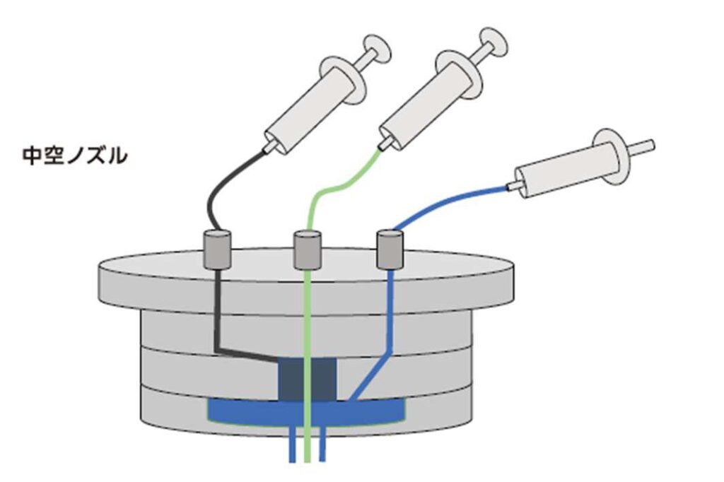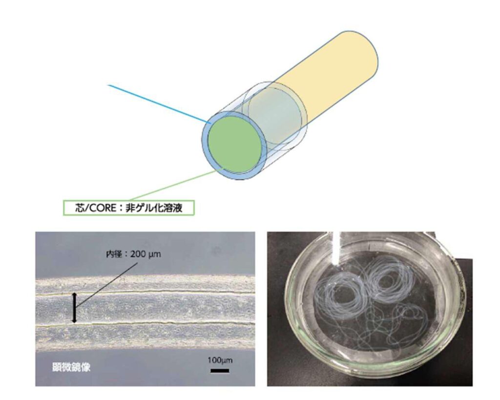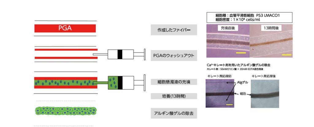 中空ゲルファイバーの中に、細胞懸濁液を充填し、培養。キレート剤でゲルを除去し細胞ファイバーを成型。