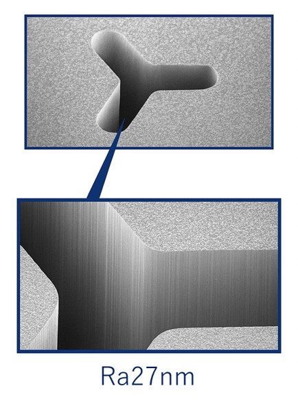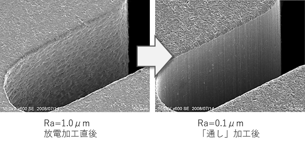 独自の「通し」加工技術により、放電加工後の内壁の面粗度向上や、ワイヤ放電加工では仕上げが難しいエッジ部の仕上げを可能にしています。